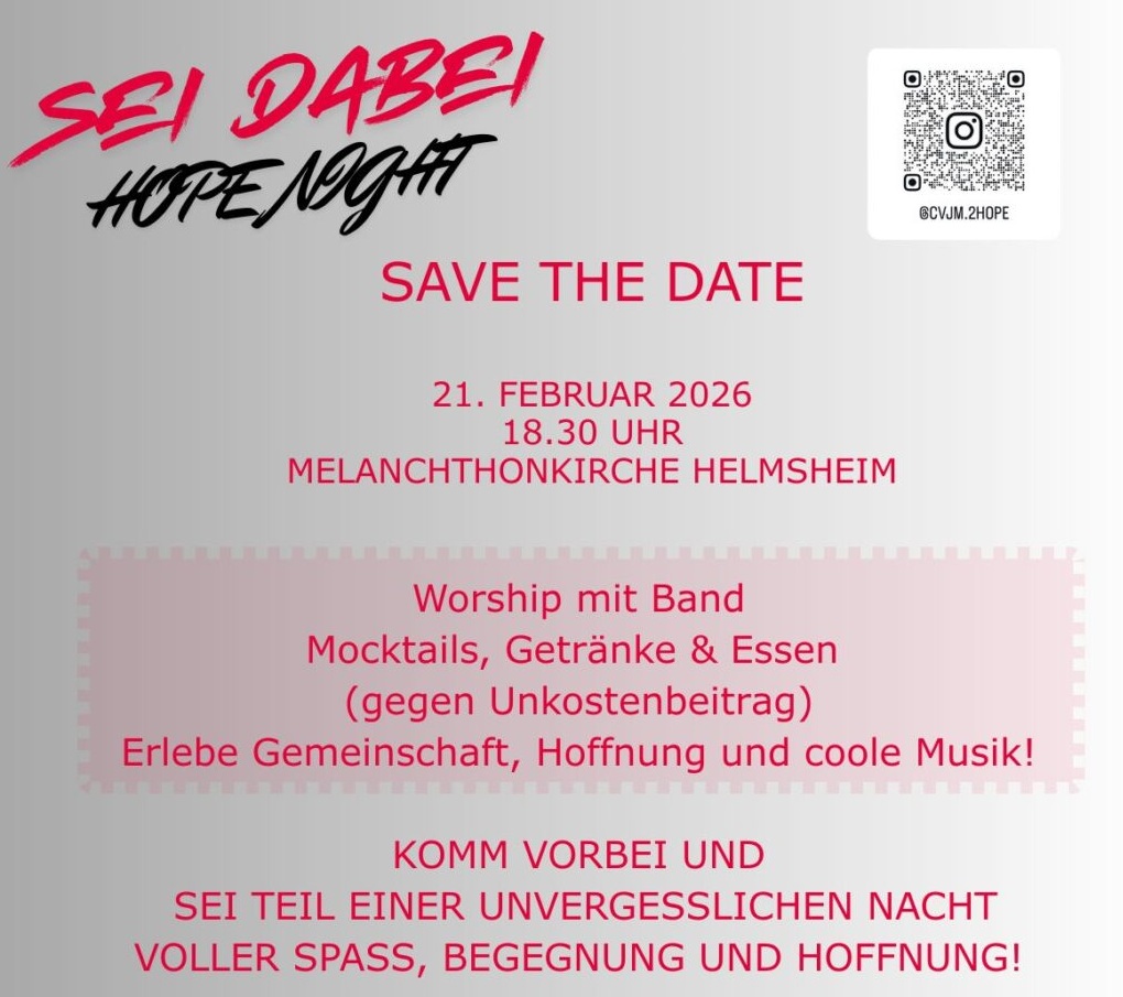 Am 21.02.2026 ab 18.30 Uhr wollen wir gemeinsam einen Abend voller Hoffnung, Gemeinschaft, Musik und guter Impulse in der Melanchthonkirche Helmsheim erleben.